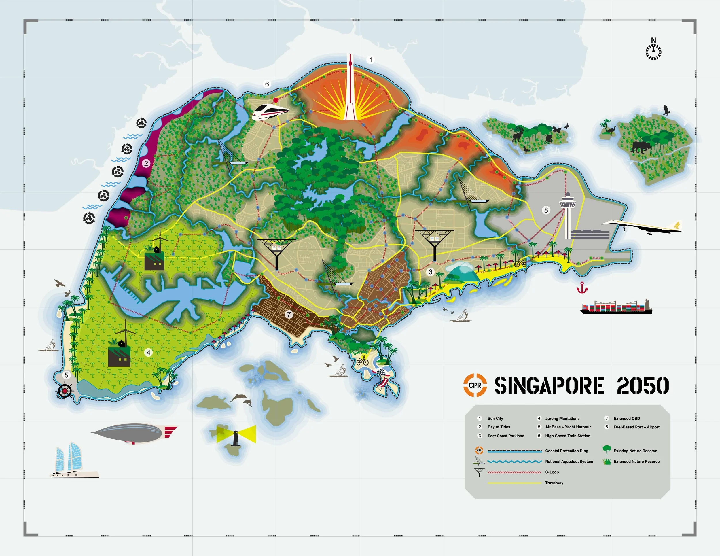 WOHA concurrently developed a masterplan for all of Singapore island and explored four different cross-programmed typologies (Sun City, Bay of Tides, East Coast Parkway, Jurong Plantations), each combining a seawall (the CPR = Coastal Protection Ring) with alternative energy harvesting (solar or tidal) and residential, industrial / commercial or leisure use. As outline for the studio, hypothetical planning guidelines for all coastal plots of the island were developed, including elements like energy production, water rights, biodiversity index and ecosystem requirements as well as the Eventual Submersion Design Concept to ensure that the implementation of this massive infrastructure remains an enjoyable one at all stages.